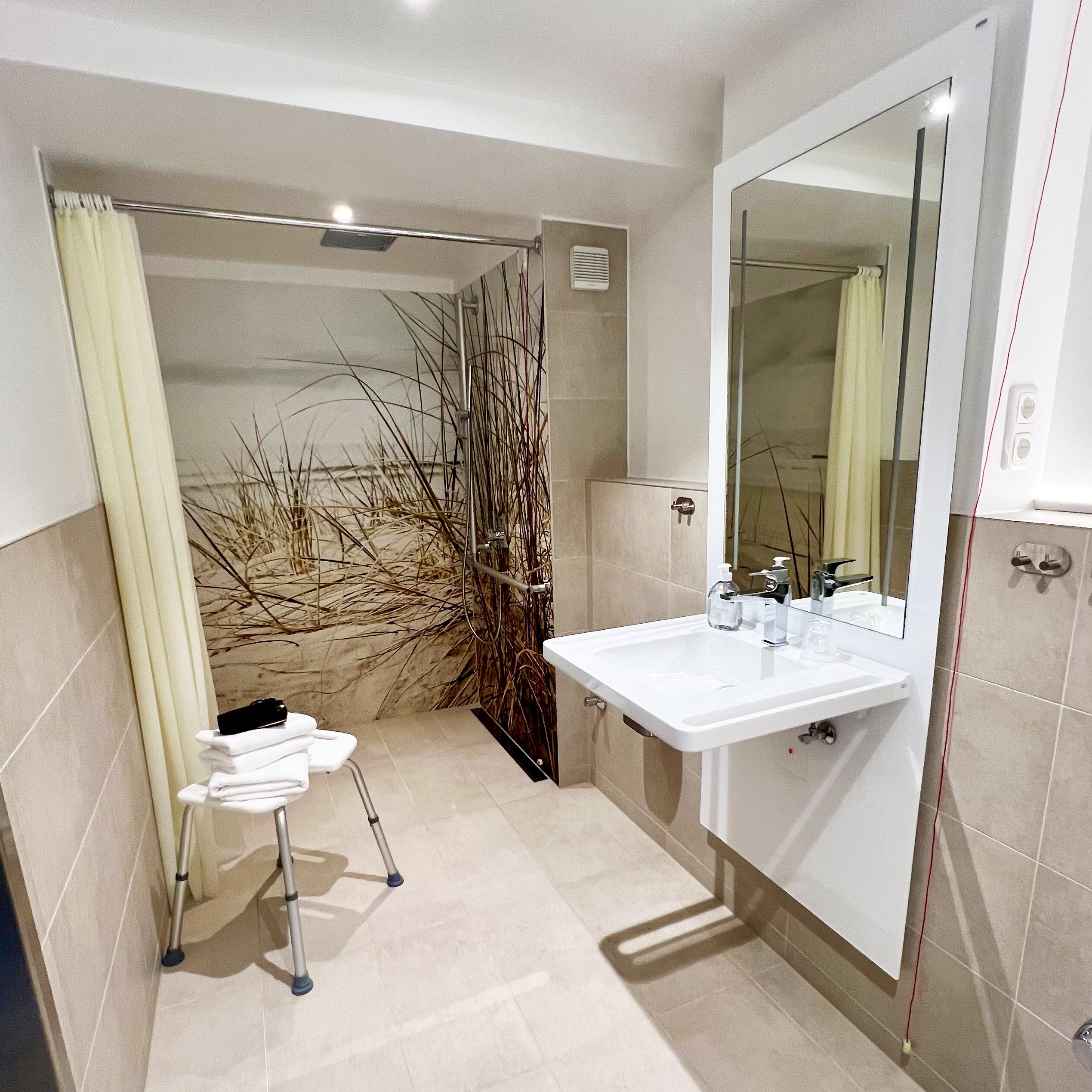 ■ Großes Badezimmer mit begehbarer Amazonasdusche, Japan-WC, Kosmetikspiegel, Haartrockner und Hygieneartikeln